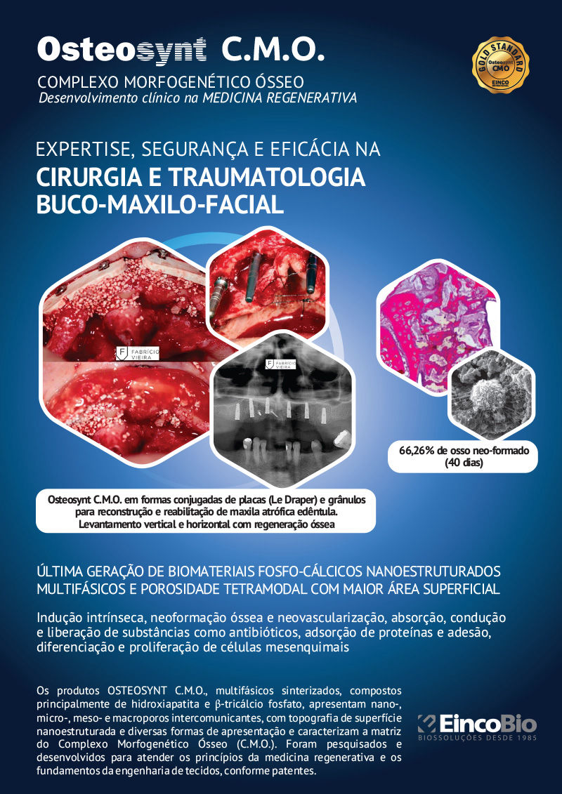 Na área de cirurgia Buco-Maxilo-Facial, as biossoluções EincoBio com seus produtos OSTEOSYNT são utilizadas em correções de fraturas dos ossos faciais, em Cirurgia Ortognática e em perdas ósseas que necessitam de reconstrução como cistos e tumores.